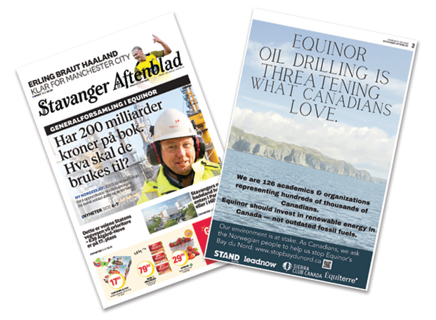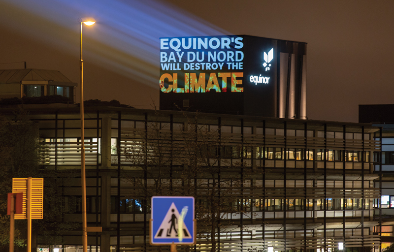 Opposition to Bay du Nord followed project developer Equinor to its home in Norway, particularly in May, when the Norwegian company held its annual general meeting. Newfoundland and Labrador’s coastline popped up in news-papers throughout the country, not as a tourism campaign but as part of a full-page ad protesting Bay du Nord. And if you missed the papers, it was hard to miss the large outdoor projections in Stavanger, at locations including the Norwegian Petroleum Museum and Equinor headquarters. From Canada, petitions have been sent and rounds of calls made to company headquarters from people opposed to the project.