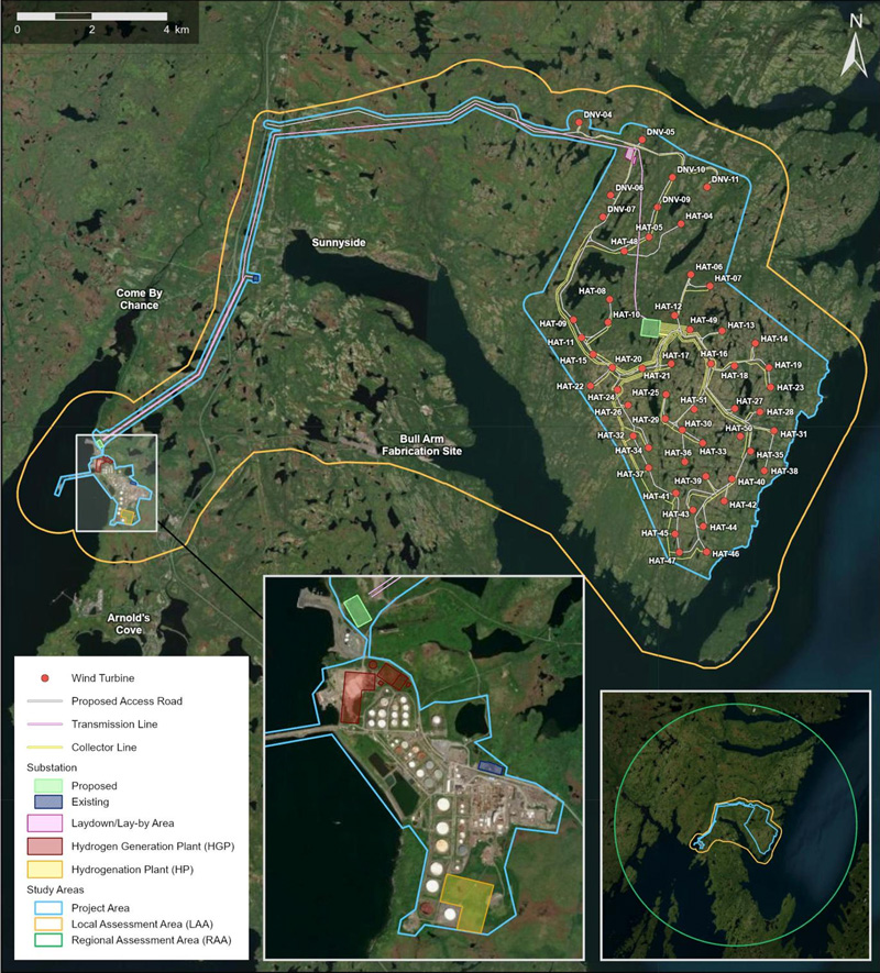 In Newfoundland and Labrador, EverWind’s filing for a separate wind-hydrogen-energy export project included some information on wind power plans, but at a poorly defined level for local individuals, albeit acceptable at this stage of regulatory review. The lack of detail challenges the local discussions and debate. For a better sense of the scale of changes: the overall project area identified covers 268,319 hectares (or about 2,683 sq. kms); the wind turbines cover roughly 129,000 hectares (1,290 sq kms), or more than 111 times larger than the Feldheim wind farm area. The company says the actual project area, or “project footprint” and footprint for wind will be smaller still, but the public is only told it is “subject to further analysis,” meaning little understanding for what will be long-term, local reality.