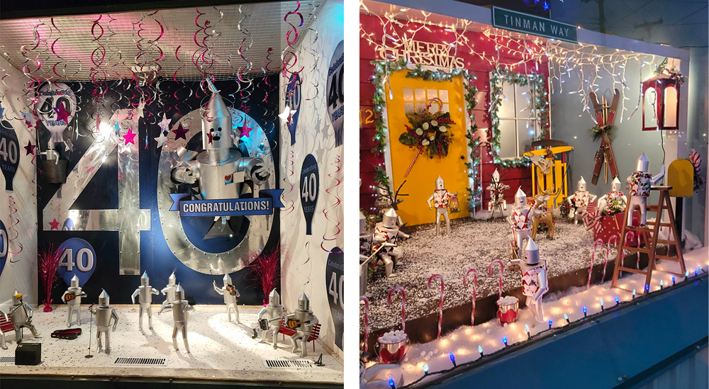 While it has a reputation for quality metalwork, Jenkins & Puddicombe is also well known in the community for its unique window displays and tin man mascot. The tradition started when Bert Puddicombe attended George Street’s first Mardi Gras Halloween event in the ‘90s and made a custom tin man outfit for the costume contest (and won). Inspired by the window displays of other local businesses, for the holidays, Janice set the tin man in a chair in their store’s large window with a copy of The Night Before Christmas. The scene was complete with a Christmas tree and other decor. It was a major hit. The tin man was then added to the company’s logo, and new window displays were created seasonally year-round. Now, instead of the large tin man, John Puddicombe handcrafts miniature versions by hand for each theme. While many express interest, these tin characters are for display only and not for sale.